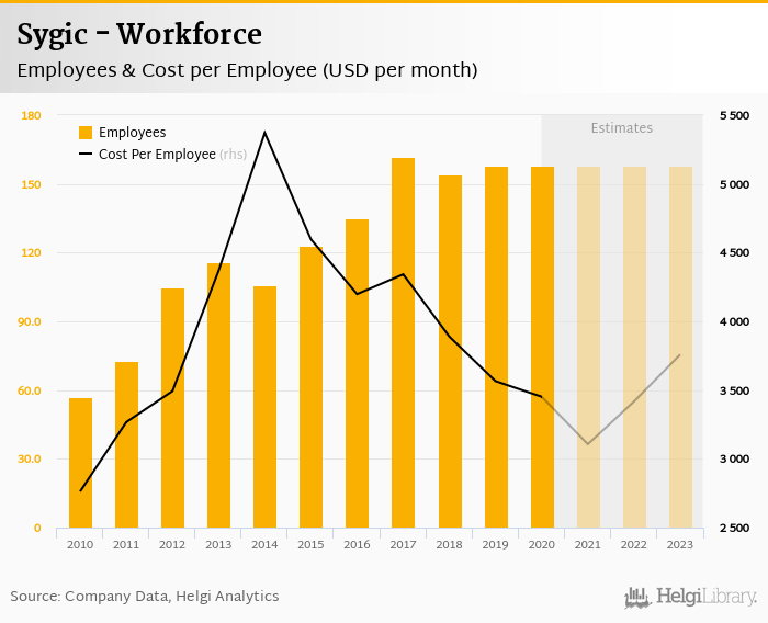 Sygic employed 158 employees in 2020, up 0% compared to the previous year. Historically, between 2010 and 2020, the firm's workforce hit a high of 162 employees in 2017 and a low of 57.0 employees in 2010.