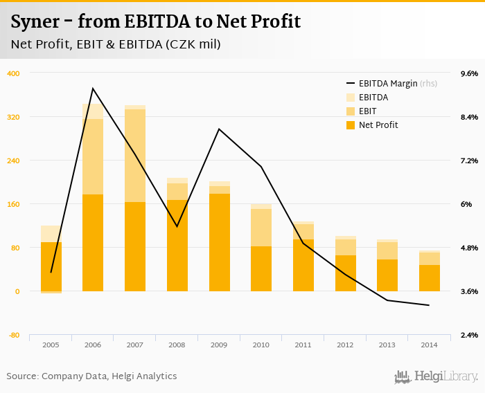 Syner made a net profit of CZK 48.0 mil with revenues of CZK 2,349 mil in 2014, down by 17.3% and down by 17.6%, respectively, compared to the previous year. This translates into a net margin of 2.04%.