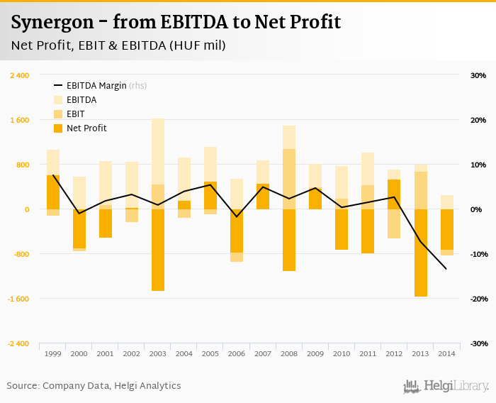 Synergon made a net profit of HUF -725 mil with revenues of HUF 4,168 mil in 2014, up by 53.7% and down by 59.9%, respectively, compared to the previous year. This translates into a net margin of -17.4%.