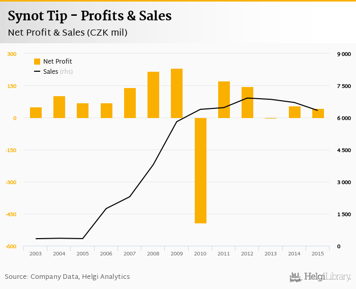 Synot Tip made a net profit of CZK 43.6 mil in 2015, down 21.5% compared to the previous year. Total sales reached CZK 6,330 mil, which is down 5.59% when compared to the previous year.
