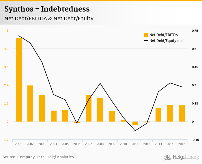 Synthos's net debt stood at PLN 655 mil and accounted for 0.284 of equity at the end of 2015. The ratio is down 0.033 pp compared to the previous year.