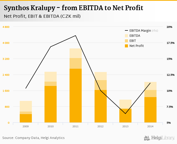 Synthos Kralupy made a net profit of CZK 1,285 mil with revenues of CZK 18,302 mil in 2014, up by 87.2% and up by 0.613%, respectively, compared to the previous year. This translates into a net margin of 7.02%.