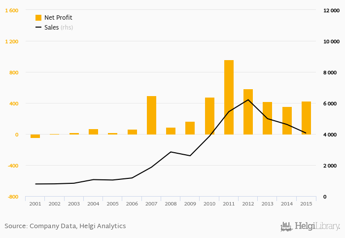 Sales have grown by 14.6% a year on average since 2005. They reached a high of PLN 6,207 mil in 2012 and a low of PLN 782 mil in 2001.