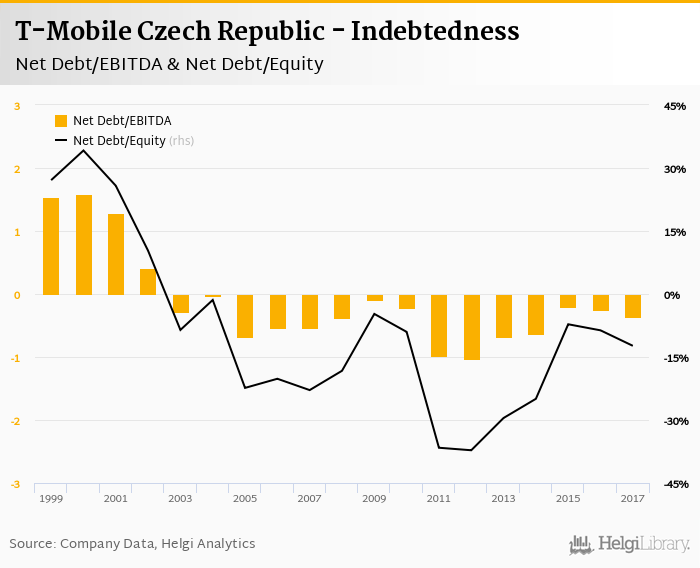 T-Mobile Czech Republic's net debt stood at CZK -3,766 mil and accounted for -12.3% of equity at the end of 2017. The ratio is down 3.68 pp compared to the previous year.
