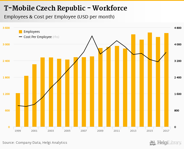 T-Mobile Czech Republic employed 3,414 employees in 2017, up 4.37% compared to the previous year. Historically, between 1999 and 2017, the firm's workforce hit a high of 3,427 employees in 2015 and a low of 1,227 employees in 1999.