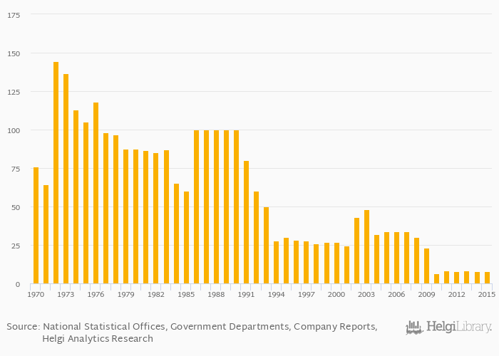 Historically, talc production in Norway reached an all time high of 145 kt in 1972 and an all time low of 6.39 kt in 2010.