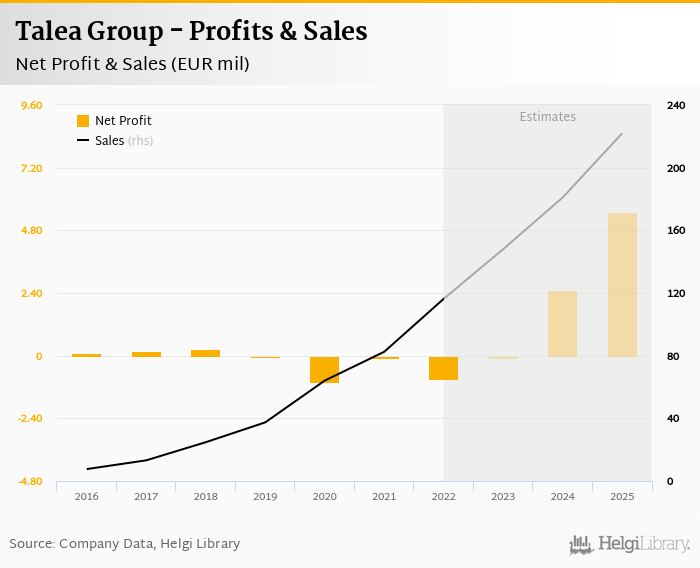 Talea Group made a net profit of EUR -0.908 mil in 2022, down 912% compared to the previous year. Total sales reached EUR 116 mil, which is up 41% when compared to the previous year.