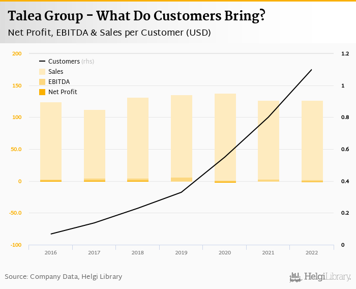 In 2022, Talea Group served a total of 1.10 mil customers, up 234% when compared to 3 years ago. A simple comparison of Talea Group's sales with a number of its customers reveals that the average customer brought the firm USD 124 revenue in 2022. In terms of profitability, a single client generated EBITDA of USD 2.27 and a net profit of USD -0.968 in 2022.