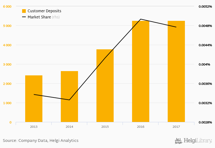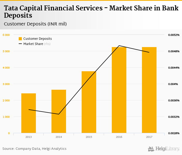 Tata Capital Financial Services accounted for 0.005% of all customer deposits taken by banks in India at the end of 2017. Historically, the bank’s market share in customer deposits reached an all time high of 0.005% in 2016 and an all time low of 0.003% in 2014.