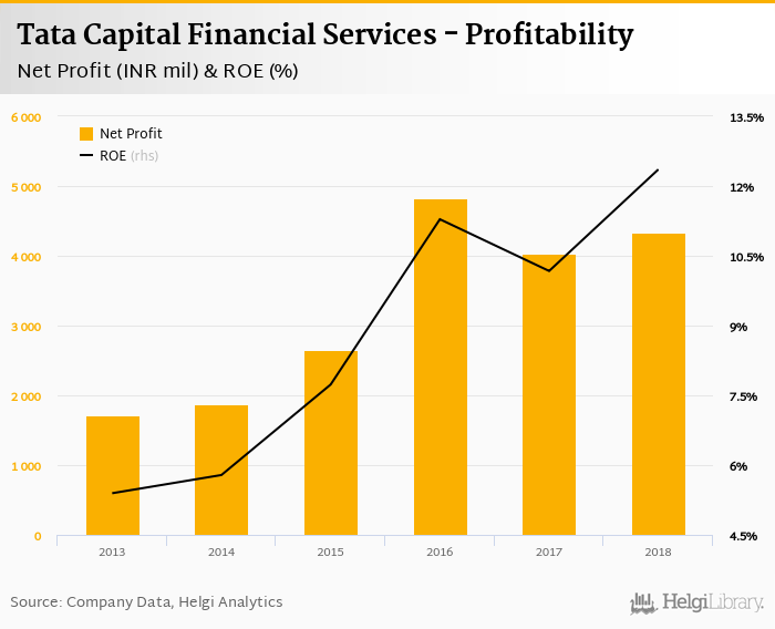 Tata Capital Financial Services made a net profit of INR 4,328 mil in 2018, up 7.42% compared to the previous year. This implies a return on equity of 12.4%.