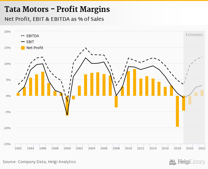 Tata Motors made a net profit of INR -121 bil with revenues of INR 2,586 bil in 2019, up by 58.1% and down by 13.6%, respectively, compared to the previous year.