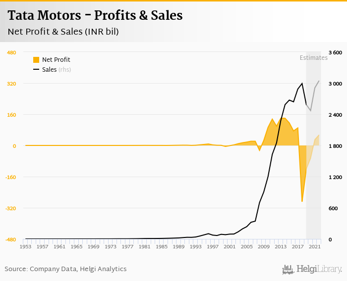 Tata Motors made a net profit of INR -121 bil in 2019, up 58.1% compared to the previous year. Total sales reached INR 2,586 bil, which is down 13.6% when compared to the previous year.