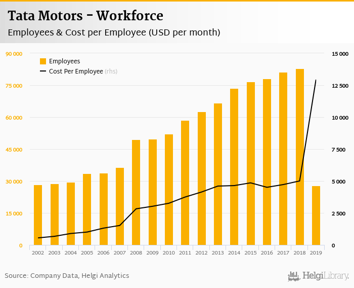 Tata Motors employed 27,802 employees in 2019, down 66.4% compared to the previous year. Historically, between 2002 and 2019, the firm's workforce hit a high of 82,797 employees in 2018 and a low of 27,802 employees in 2019.