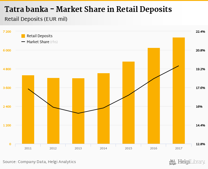 Tatra banka accounted for 19.5% of all retail deposits taken by banks in Slovakia at the end of 2017. Historically, the bank’s market share in retail deposits reached an all time high of 19.5% in 2017 and an all time low of 15.4% in 2013.