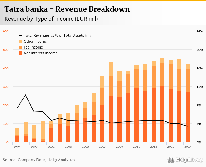 Comparing Tatra banka with its closest peers, VUB Banka generated total revenues of 3.66% of assets in 2017, Slovenska Sporitelna operated with 3.48% revenue margin and Prima Banka Slovakia produced total income worth 2.11% of assets.