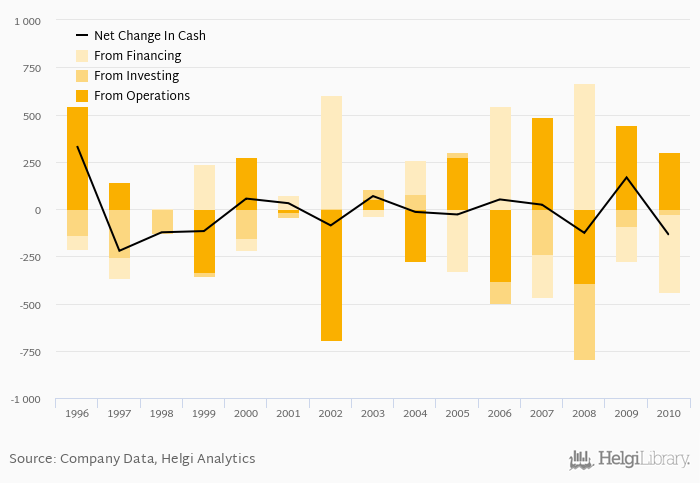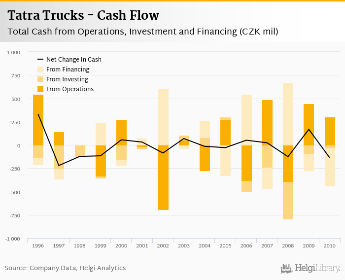 Tatra Trucks's operating cash flow stood at CZK 304 mil in 2010, down 31.3% when compared to the previous year. Historically, between 1996 - 2010, the firm’s operating cash flow reached a high of CZK 543 mil in 1996 and a low of CZK -691 mil in 2002.