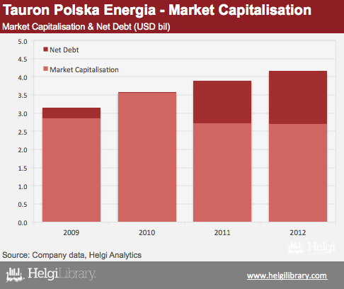 Tauron stock trades at relatively low valuation. The market capitalization of the company reached USD 2.7 bil at the end of 2012, implying the stock trading at PE of less than 6x, or at half its book value