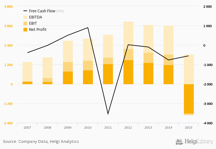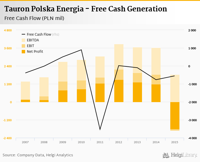 The company generated cash, defined by a sum of net profit and depreciation, of PLN 25.5 mil or 0.139% of sales. When investments are excluded, free cash flow reached PLN -555 mil, or -3.02% of sales in 2015.