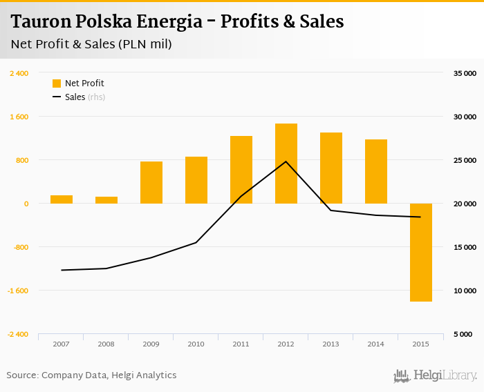 Tauron Polska Energia made a net profit of PLN -1,807 mil in 2015, down 253% compared to the previous year. Total sales reached PLN 18,375 mil, which is down 1.09% when compared to the previous year.