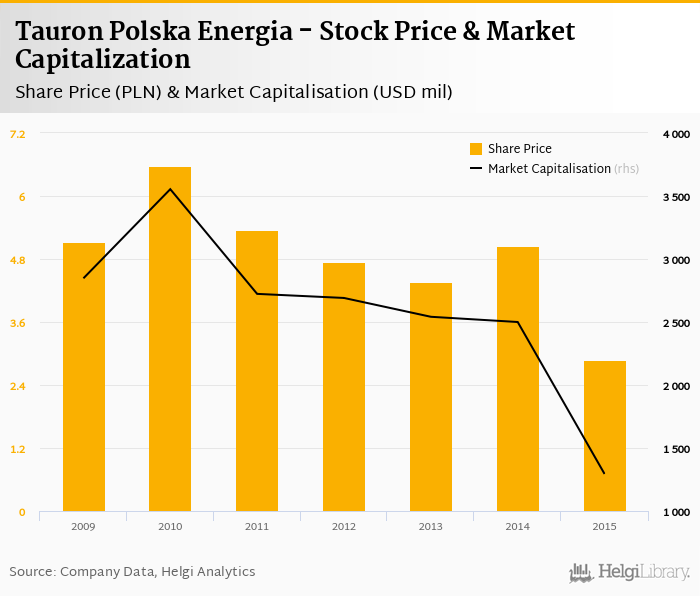 Tauron Polska Energia stock traded at PLN 2.88 per share at the end 2015 implying a market capitalization of USD 1,294 mil.