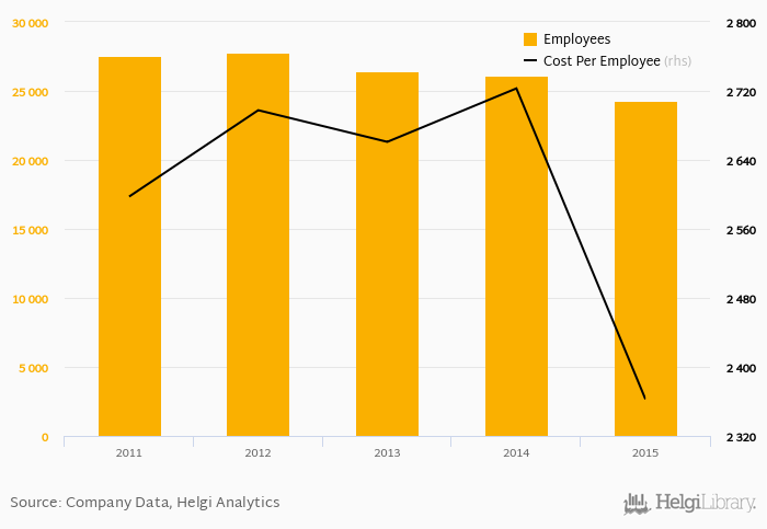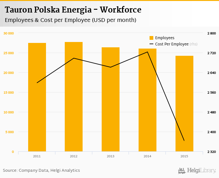 Tauron Polska Energia employed 24,277 employees in 2015, down 7.01% compared to the previous year. Historically, between 2011 and 2015, the firm's workforce hit a high of 27,816 employees in 2012 and a low of 24,277 employees in 2015.