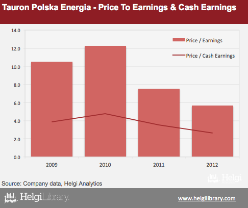 Tauron stock trades at relatively low valuation. The market capitalization of the company reached USD 2.7 bil at the end of 2012, implying the stock trading at PE of less than 6x, or at half its book value
