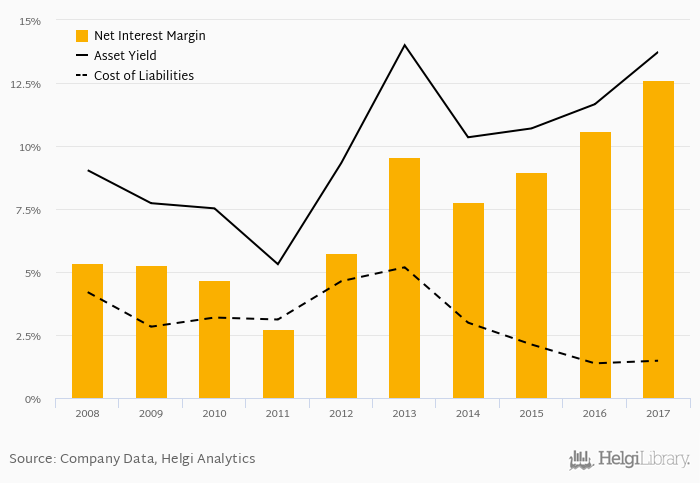 Historically, the bank’s net interest margin reached an all time high of 12.6% in 2017 and an all time low of 2.75% in 2011. The average margin in the last five years amounted to 9.89%.