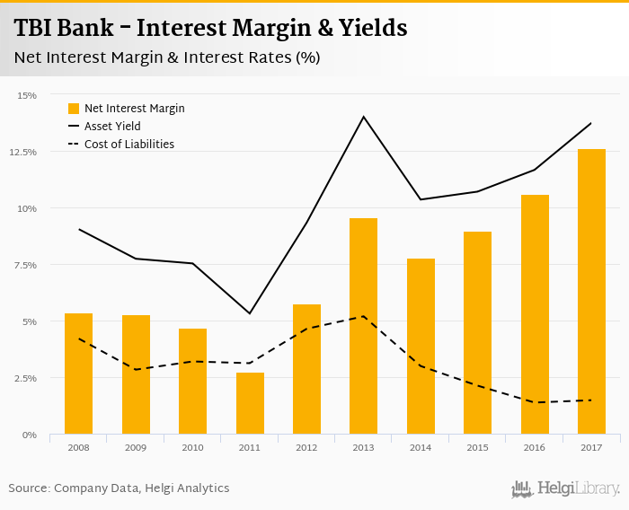 TBI Bank's net interest margin amounted to 12.6% in 2017, up from 10.6% compared to the previous year.
