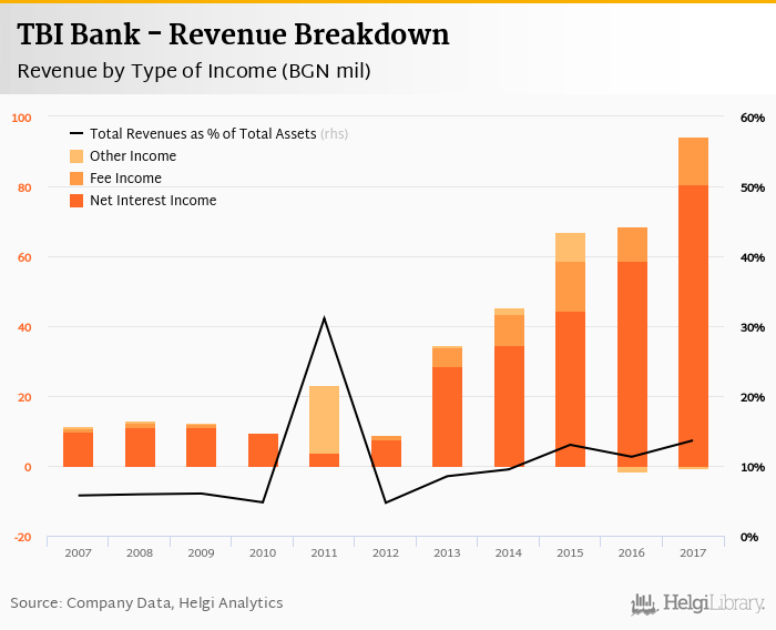 Comparing TBI Bank with its closest peers, DSK Bank generated total revenues of 5.78% of assets in 2017, United Bulgarian Bank operated with 4.70% revenue margin and Raiffeisenbank Bulgaria produced total income worth 4.37% of assets.