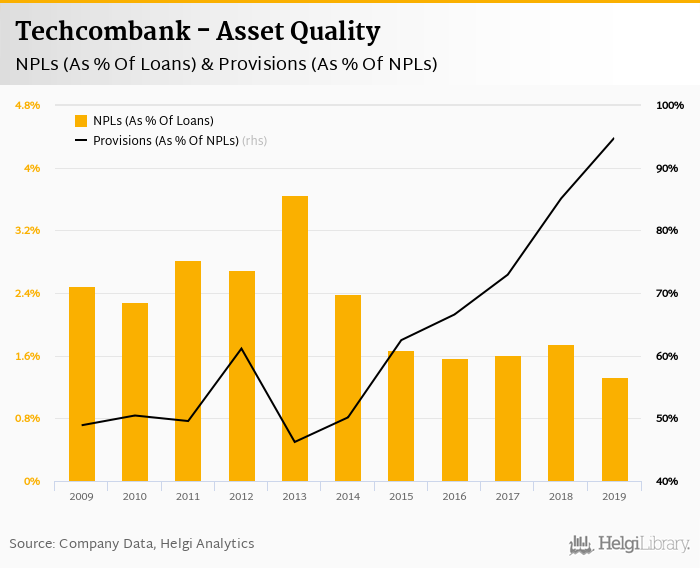 Techcombank's non-performing loans reached 1.33% of total loans at the end of 2019, down from 1.75% compared to the previous year. Historically, the NPL ratio hit an all time high of 3.65% in 2013 and an all time low of 1.33% in 2019.