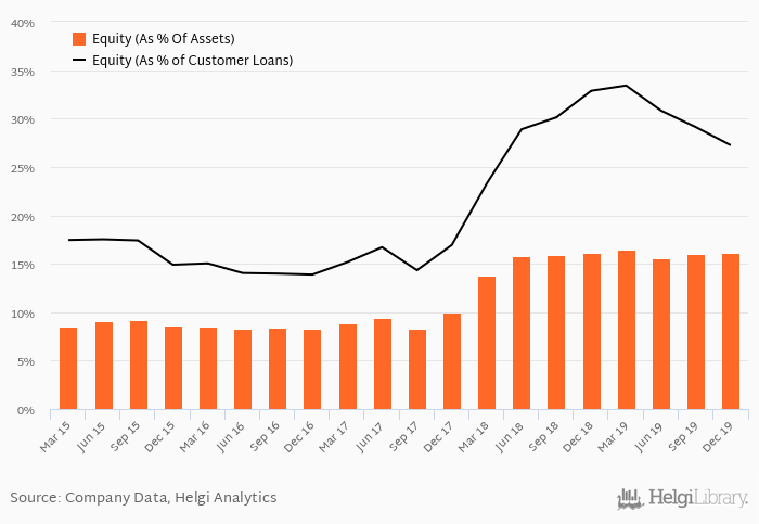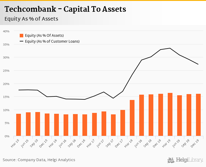 Techcombank's Equity reached 16.2% of total assets in the 4Q2019, up from 16.1% for the previous year. As a share of net customer loans, the ratio amounted to 27.2% at the end of the fourth quarter of 2019.