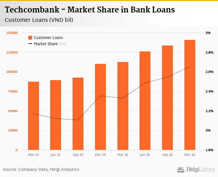 Techcombank's customer loans reached VND 141,121 bil in 2016-12-31, up 5.29% compared to the previous year.