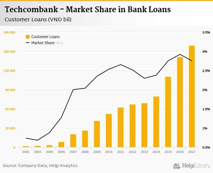 Techcombank accounted for 2.75% of all customer loans issued in Vietnam at the end of 2017. Historically, the bank’s market share in customer loans reached an all time high of 2.92% in 2016 and an all time low of 0.679% in 2003.