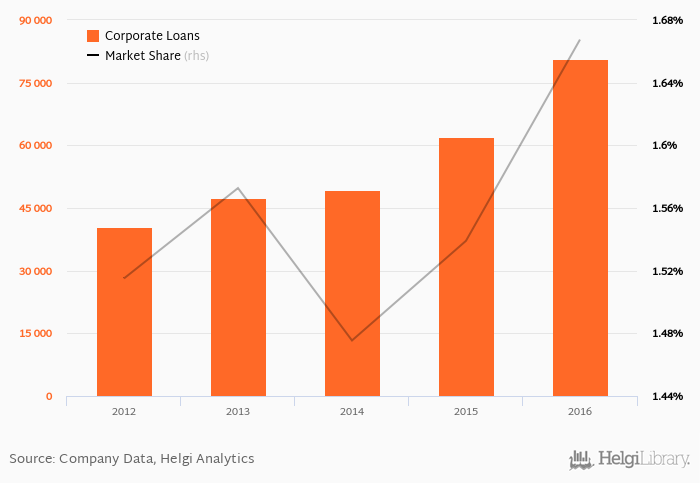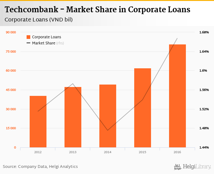 Techcombank accounted for 1.67% of all corporate loans issued in Vietnam at the end of 2016. Historically, the bank’s market share in corporate loans reached an all time high of 1.67% in 2016 and an all time low of 1.48% in 2014.