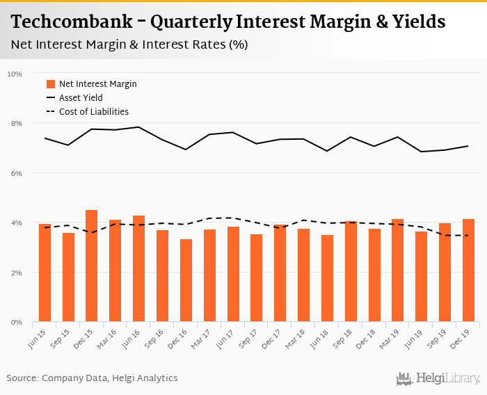 Techcombank's net interest margin amounted to 4.16% in the fourth quarter of 2019, up from 3.98% when compared to the previous quarter.