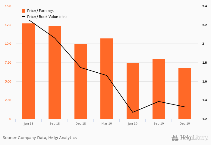At the end of 4Q2019, the bank traded at price to earnings of 6.80x. Within the last five years, the multiple reached an all time high of 12.7x in 2Q2018 and an all time low of 6.80x in 4Q2019 with an average of 9.73x.