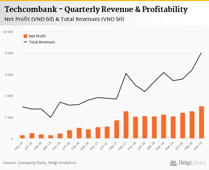 Techcombank made a net profit of VND 3,029 bil under revenues of VND 8,003 bil in the fourth quarter of 2019, up 34.4% and 30.1% respectively when compared to the same period last year.