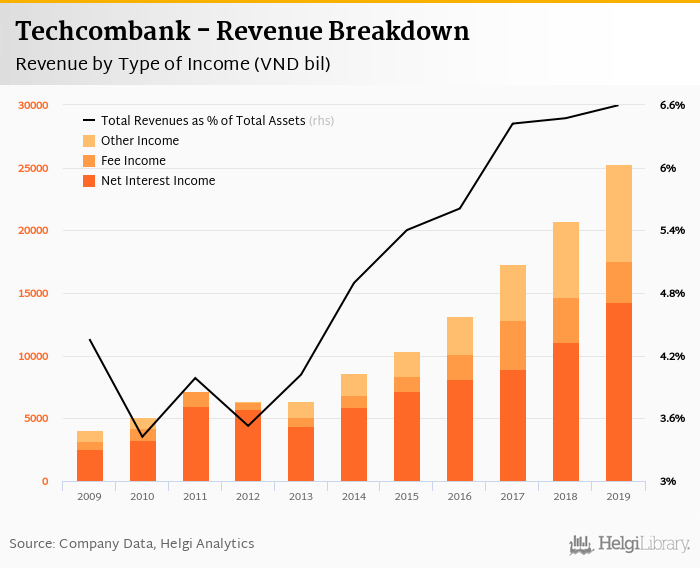 Historically, the bank’s revenues containing of interest, fee and other non-interest income reached an all time high of VND 25,318 bil in 2019 and an all time low of VND 4,036 bil in 2009. The average revenue in the last five years amounted to VND 17,394 bil.