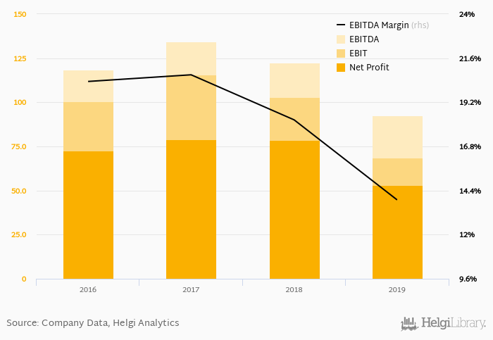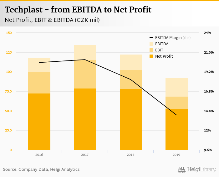 Techplast made a net profit of CZK 53.0 mil with revenues of CZK 668 mil in 2019, down by 32.6% and down by 0.494%, respectively, compared to the previous year. This translates into a net margin of 7.94%.