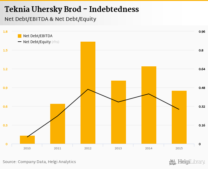 Teknia Uhersky Brod's net debt stood at CZK 72.2 mil and accounted for 0.293 of equity at the end of 2015. The ratio is down 0.133 pp compared to the previous year.