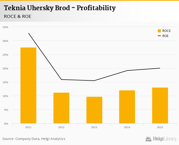 As far as Teknia Uhersky Brod's peers are concerned, Automotive Lighting generated ROE of 46.9% and ROCE of 47.7% in 2015. Viscuma's profitability reached 19.6% and 40.7%, respectively. Isolit-Bravo operated with 8.18% and 10.8% returns in 2015.