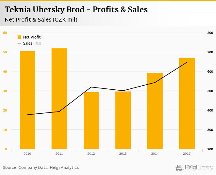 Teknia Uhersky Brod made a net profit of CZK 46.8 mil in 2015, up 18.7% compared to the previous year. Total sales reached CZK 645 mil, which is up 19.2% when compared to the previous year.
