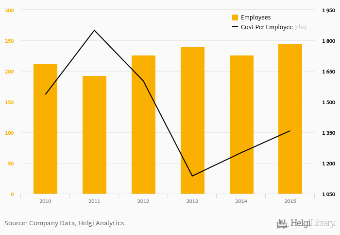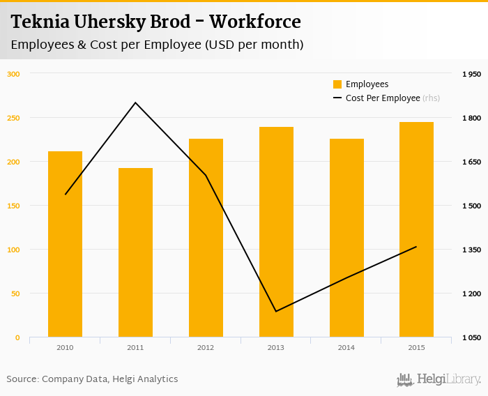 Teknia Uhersky Brod employed 245 employees in 2015, up 8.41% compared to the previous year. Historically, between 2009 and 2015, the firm's workforce hit a high of 245 employees in 2015 and a low of 193 employees in 2011.