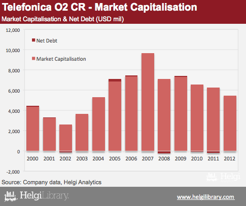 Telefónica Czech Republic's value reached maximum in 2007 when its market capitalization touched USD 10 bil. Financial crisis, increased competition and regulatory pressure all reduced Company's value to USD 5.5 bil at the end of 2012