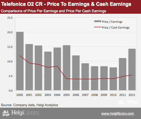 From a growth company a decade ago, Telefónica Czech Republic has changed into a utility cash cow, in line with the majority of the telecommunications sector. Similarly, valuation of the Company underwent a massive change, from trading at nearly 12x in terms of price to cash earnings in 2000 to only around 5.3x at the end of 2012