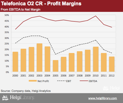 Telefónica Czech Republic is a major integrated operator in the Czech Republic. From a growth company a decade ago, the Company has changed into a utility cash cow, in line with the majority of the telecommunications sector. From the peak of nearly CZK 65 bil, the Company's sales have been declining as market saturation and increased competition and regulatory pressure have been taking their toll. The net profit reached CZK 6.8 bil in 2012, down 42% compared to 2008