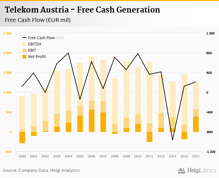 Telekom Austria made a net profit of EUR 393 mil with revenues of EUR 4,027 mil in 2015, up by 312% and up by 0.215%, respectively, compared to the previous year. This translates into a net margin of 9.75%.