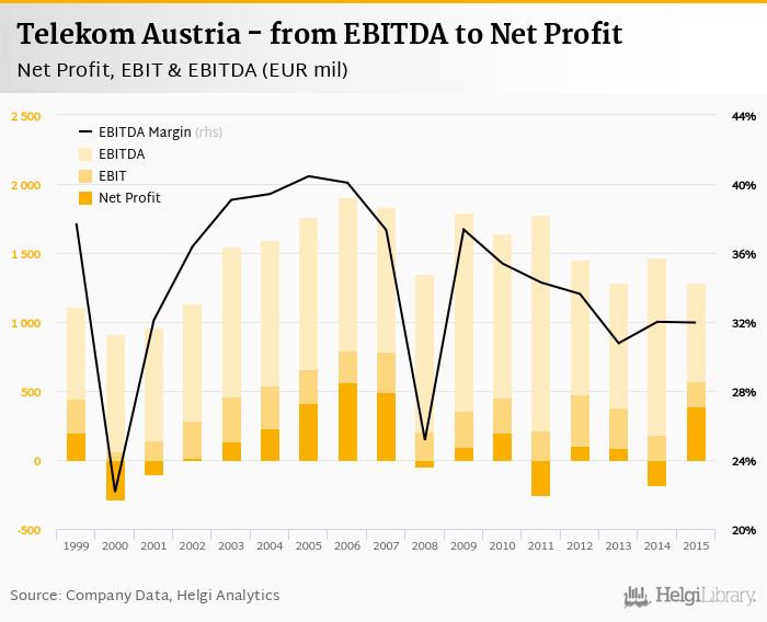 Telekom Austria made a net profit of EUR 393 mil with revenues of EUR 4,027 mil in 2015, up by 312% and up by 0.215%, respectively, compared to the previous year. This translates into a net margin of 9.75%.