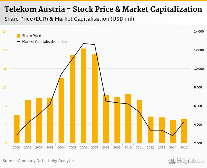 Telekom Austria stock traded at EUR 5.29 per share at the end 2015 implying a market capitalization of USD 4,252 mil.