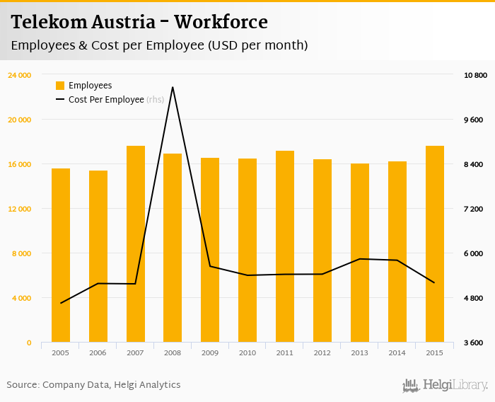 Telekom Austria employed 17,673 employees in 2015, up 8.82% compared to the previous year. Historically, between 2005 and 2015, the firm's workforce hit a high of 17,673 employees in 2015 and a low of 15,428 employees in 2006.
